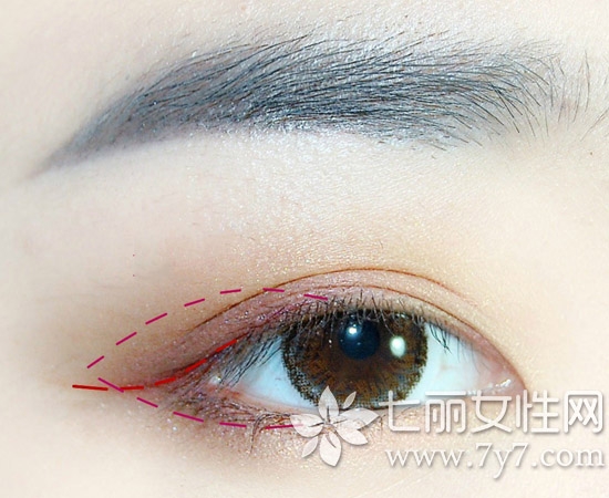 第五步:用一把眼线刷沾取正红色唇膏,轻轻勾勒出眼尾眼线,妩媚动人,按图所示范围晕染酒红色眼影。