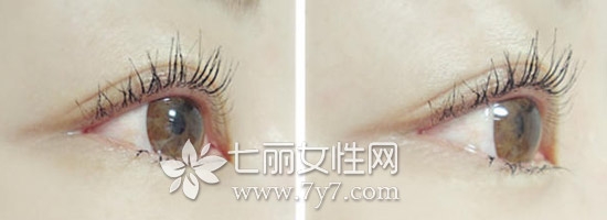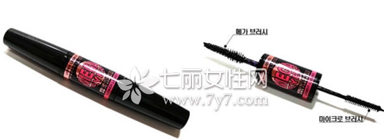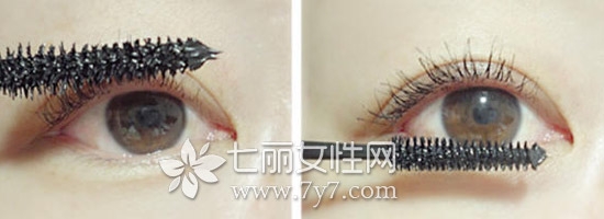 左边是不带妆的睫毛。先用大刷头从睫毛根部开始刷上睫毛,然后用小刷头只刷上睫毛的尾端。