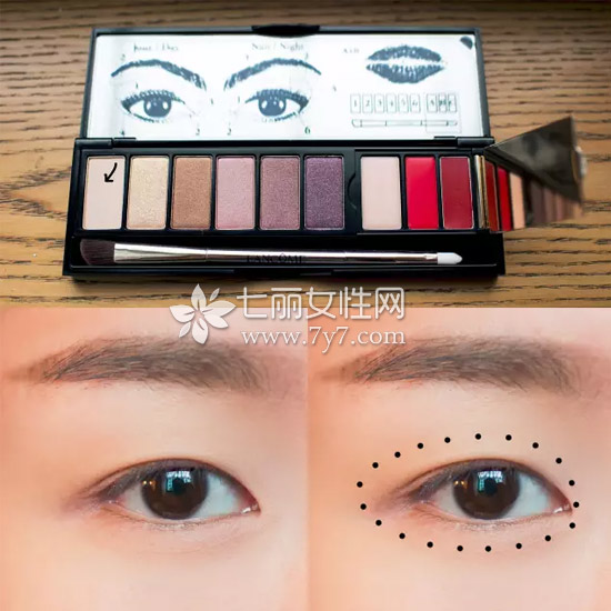 首先,用最浅色眼影打底,涂满整个眼眶,让眼睛看起来更干净,也能更好地让之后的眼影显色,防晕染不脱妆。