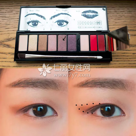 再用深咖色画在眼尾的地方,让眼睛看上去更有神和上扬。最后,用深紫色加在下外眼角靠近睫毛根部的位置,有放大眼睛的功效,微闪的质感也非常适合party。