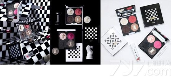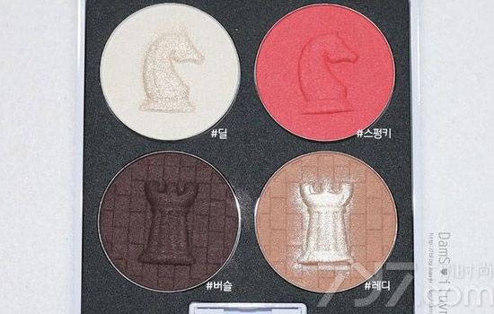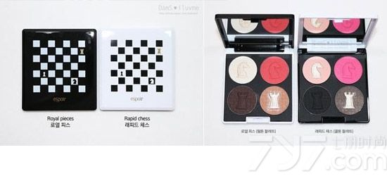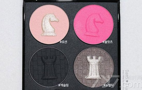 黑色和白色外壳代表着内里不同颜色的两款四色眼影,粉饼上也印刻着国际象棋图形,售价韩币35000元。
