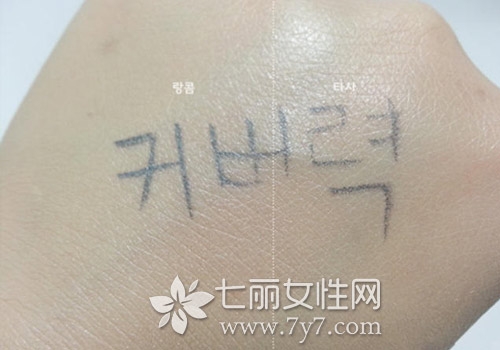 左边是兰蔻的,右边是其他公司的产品。能明显看出兰蔻的产品虽然是水润型的,但妆后不是那么粘腻,纸片几乎没有沾在手背上。