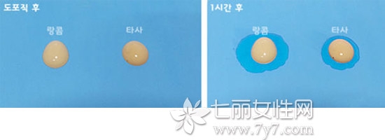 左边是刚滴在吸油纸上的效果,右边是1小时后的效果。左边的产品是兰蔻的,右边的是其他公司的。能看出兰蔻的产品含油分稍微多点,所以适合干皮或者混合皮偏干的MM使用。