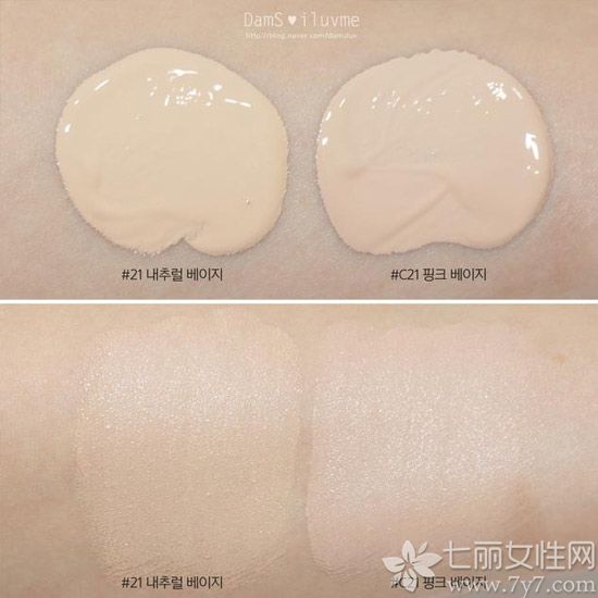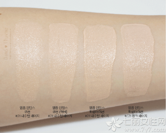 左起两款为气垫粉底的21#/21#遮瑕款,右边两款则是这次新出的21#自然色/C21#自然偏粉色,从手臂试用来看,右边的两款的确要更加滋润和有光泽一些。
