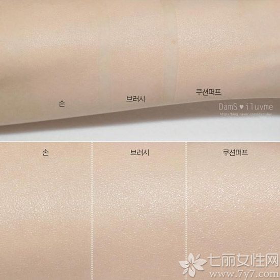 这三款涂抹方式左起为手—刷子—气垫粉扑,放大来看,用手涂抹妆感略重但遮瑕不错,刷子更加贴合,气垫粉扑则更加透亮。