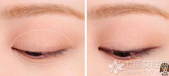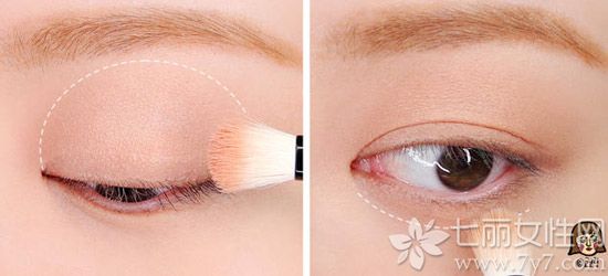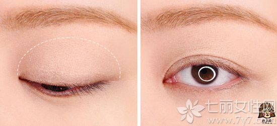 STEP3:将米金色眼影呈半圆形在上眼睑涂抹打底。