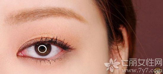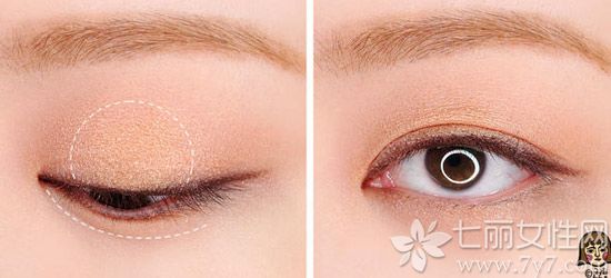 STEP6:把珠光橘棕色涂抹在眼球中间和下眼睑前2/3位置来提亮。