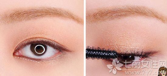 STEP7:画上黑色内眼线(注意下眼线只画前1/2),夹翘睫毛,刷上睫毛膏。