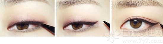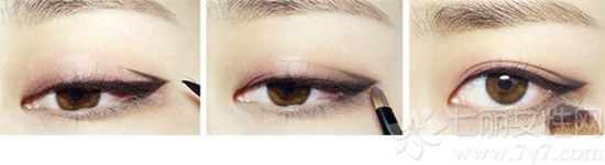 STEP14:眼尾处的眼线要自然往上挑,可以下眼线向上的弧度自然勾画。