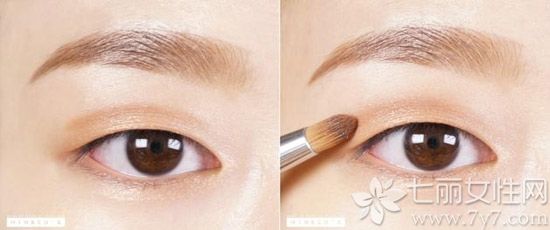 STEP3:把浅棕色眼影涂抹在眼窝下方,并朝眼尾方向晕开。