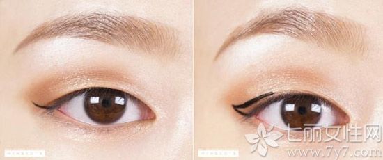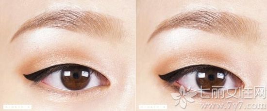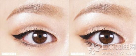 STEP5:取出一支有极细笔头:眼线液笔,紧贴睫毛画内眼线,眼尾延伸后上扬,如右图般在末端向中间位置再回勾一段线条。