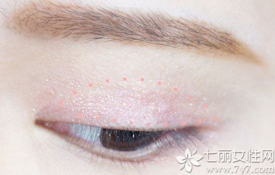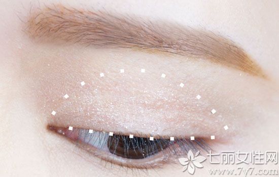 第一步:4号色的笔作为眼部打底,铺在上眼皮,范围如下图,用手指或化妆刷晕染开来。4号色适合画卧蚕和眼部提亮及打底。