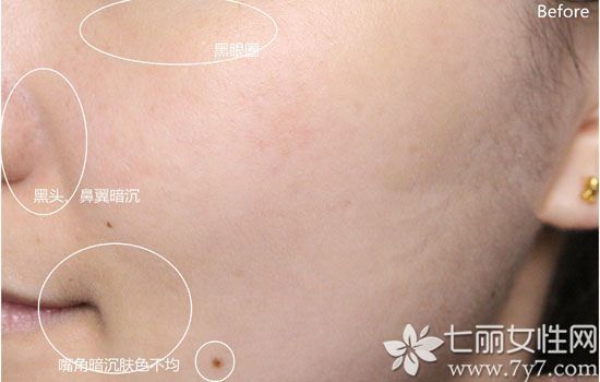 可以看得出素颜有黑眼圈、鼻头上有黑头且鼻翼暗沉,嘴角暗沉肤色不均,有明显的痣。