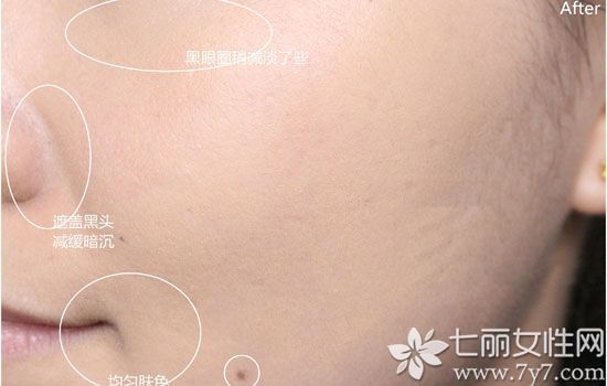 上妆后可以发现黑眼圈稍微减淡了些,遮盖黑头,减缓暗沉,均匀肤色,可以看得出网格粉底可以遮盖住小瑕疵,均匀整体肤色。