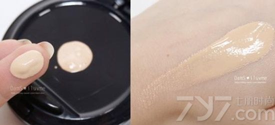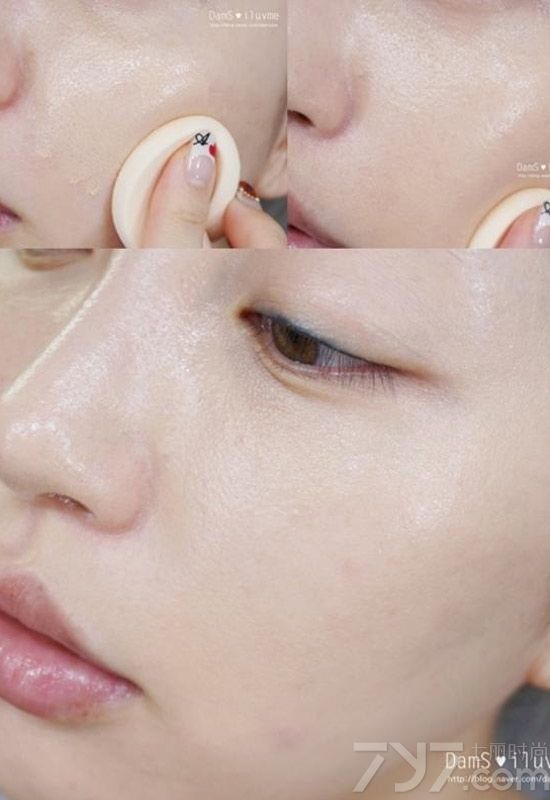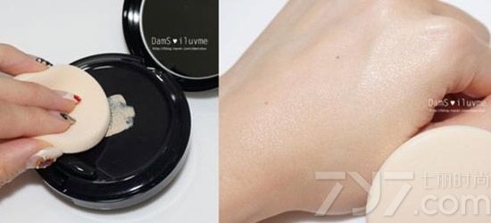 用粉扑沾取粉底后在脸部均匀涂开,遮瑕又滋润,肌肤水润透亮。