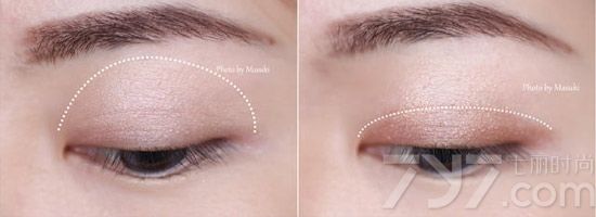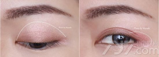 Step2:用B珠光棕色画在眼帘的部分,不超过双眼皮线外,可来回晕染加深色彩。