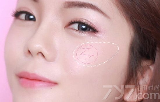 Step4:用D嫩粉色晕刷在眼尾这个范围,连下眼尾处要需要涂画到。