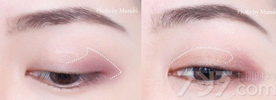 Step3:用大号眼影刷取白色眼影晕刷在眼皮褶线上方的范围。
