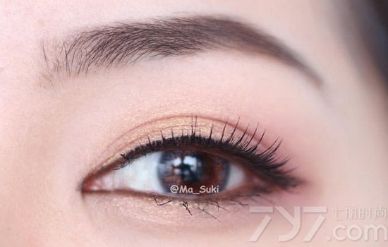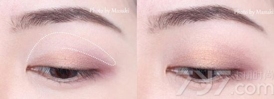 Step2:然后用中号眼影刷取金色从眼头部分往眼窝中央涂抹,范围不超过眼皮褶线。