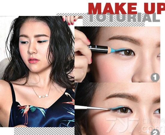 Step 1 先在睫毛根部画好内眼线,再用湖水蓝的眼线笔贴着黑色眼线上方、眼球中央开始往后画;