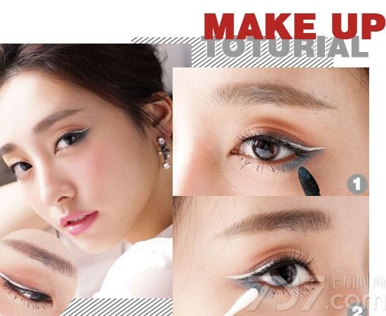 银色眼线液+蓝绿色的眼影点缀,带点华丽感,很有派对妆的感觉。这款眼妆先用桃粉色眼影轻抹上眼睑的后半段,在画上半截银色眼线的基础上,加上眼影部分: