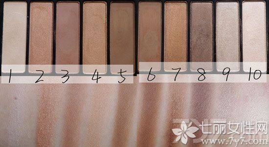 7号是珠光的铜色,也同样不是金属感的。8号是深巧克力色,属于中性色调的棕色。9号是带灰调的米色,很细腻的光泽但不算闪的珠光。10号是珠光肉粉色,也是适合打底也适合眼头提亮。