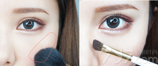第八步:双色腮红两色混合在颧骨处轻轻地向前画斜线。用最浅色和中间色混合画鼻影。这里使用的产为3CE双色腮红peach crush。