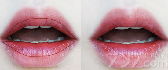 第九步:用润唇膏滋润唇部后,将口红涂抹在图示范围然后用唇刷或者手指晕染开。豆沙色唇彩涂抹在全部唇部剩余范围,两色衔接处稍微晕染下哦。这里使用的产品为:THE SAEM得鲜kiss button lips matte 06#、爱丽小屋玫瑰丝绒气垫唇膏07#。
