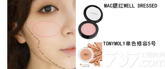 第七步:腮红画在眼下,少量多次晕染制造桃花肌的感觉,修容粉修饰脸侧颧骨下方位置,还有下颌边缘加重修容打造小脸效果。这里使用的产品分别为:MAC腮红well dressed、tonymoly单色修容5号。