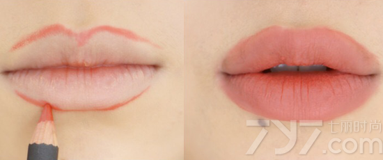 第八步:按照石原里美的唇形画出外轮廓,上下加宽加厚,整体用手指晕开,裸色哑光唇釉涂抹整个唇部,叠加一层滋润型唇膏增加厚度。这里使用的产品分别是:MAC造型唇线笔redd、阿玛尼红管唇釉500、VISEE蕾丝BE320。