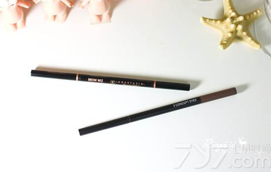 Anastasia双头眉笔做工是非常好的,这支眉笔一头是眉笔,另外一头则是螺旋刷,二合一的设计很方便。Anastasia眉笔笔头的螺旋刷比常见眉笔的螺旋刷要细很多。它的材质比MAC略硬一点,但是没有MAC那么顺滑。