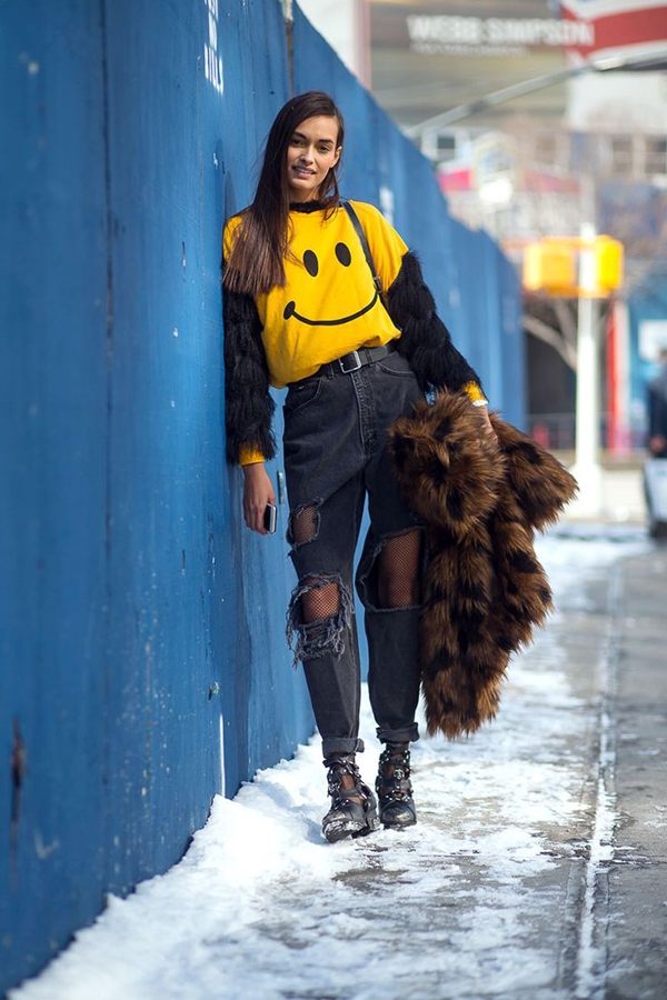 笑脸的卡通t恤搭配皮冻的牛仔长裤披上皮草后是一本正经的造型,敞开或者脱下以后就是这样充满活力年轻十岁。