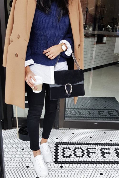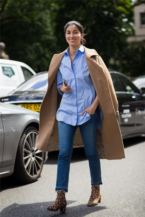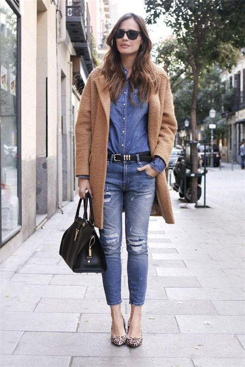 虽然衬衫的保暖欠佳,但是许多丽人们依然无法放弃百搭的牛仔衬衫,蓝色牛仔衬衫和暖色的驼色呢子大衣形成对比带来时髦chic感。