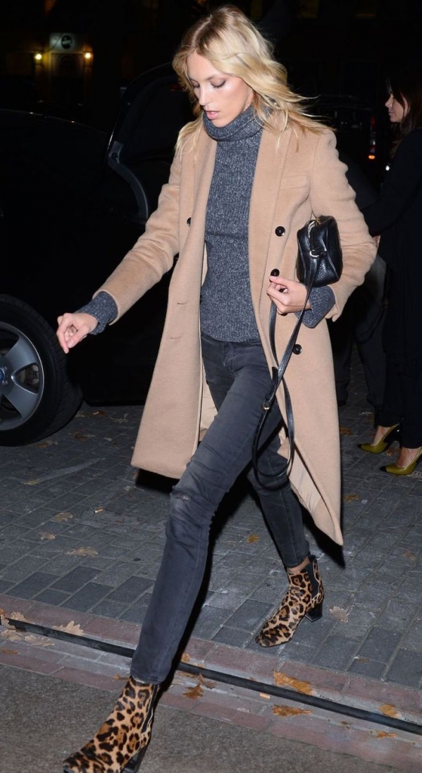 ⑤驼色呢子大衣+豹纹元素的呼应搭配