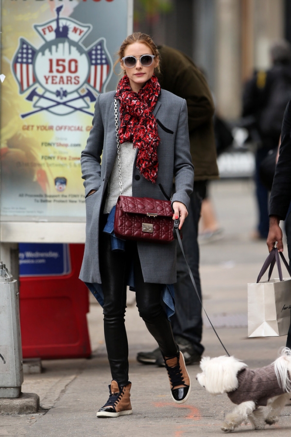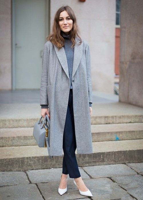 简约的黑白灰搭配很好的把握了比例,即使把大衣脱掉灰色的打底衫和黑色的铅笔裤和白色的尖头高跟鞋也是很时髦的一套搭配。