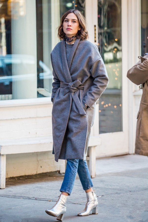 浴袍式的灰色大衣和复古的洗水牛仔搭配充满复古风情,银色的及踝靴点亮整个造型。