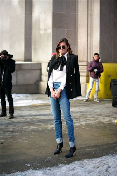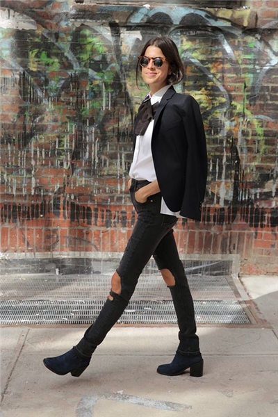 衬衫与西服外套的组合非常的适合职场OL着装,而蝴蝶结领的款式加多了时尚感。纽约时尚博主Leandra Medine的下装搭配破洞牛仔裤个性十足但并不适合正式场合。图二的时尚达人值得职场lady借鉴,短裤不适应换成九分烟管裤就ok~