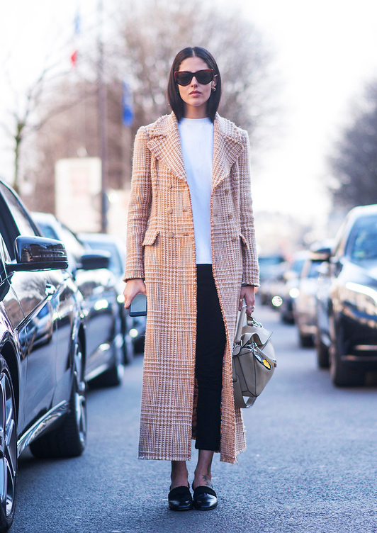 格纹的驼色大衣个性十足搭配黑色的九分裤露出脚踝使造型不会过于花哨又显高。
