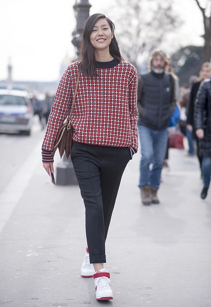 超模刘雯用格纹运动感毛衣搭配运动鞋,色调风格都相互呼应。