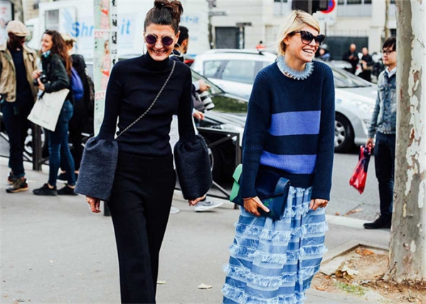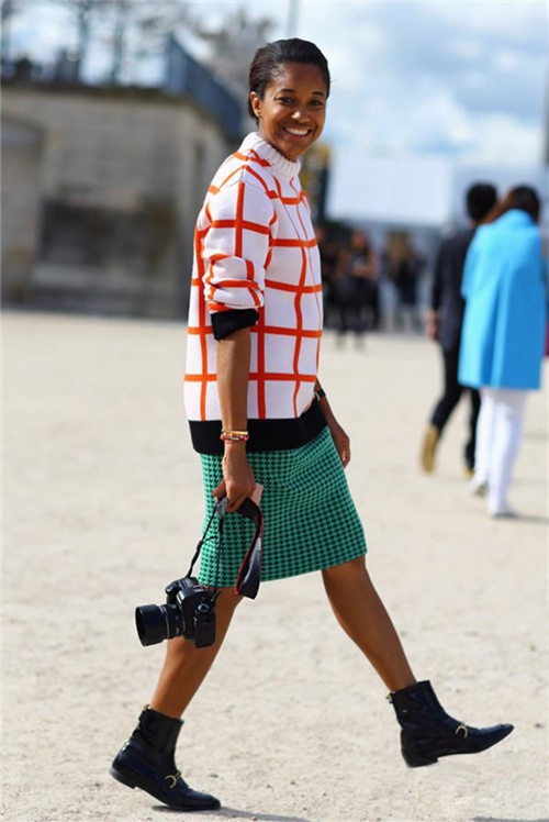 粗格纹花色毛衣搭配细格纹短裙,这种大小对比的格纹元素搭配非常的chic,许多时髦人士都喜欢用这种格纹搭配方式。