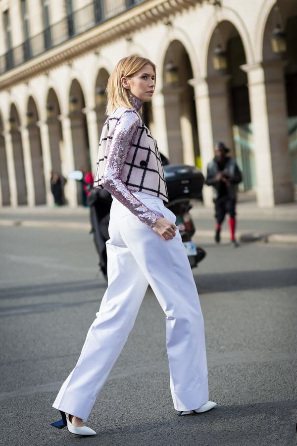 短款亮片夹克当然要聪明的选择单色的单品来搭配,这样的搭配非常和谐又显高。