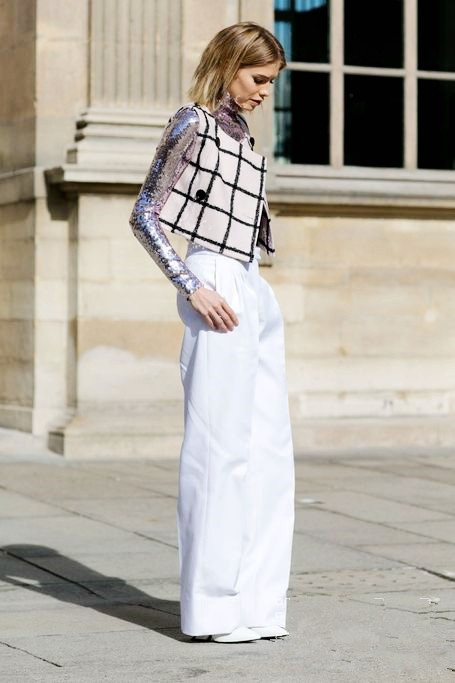 短的夹克加上高腰的阔腿裤使造型高上加高,腿仿佛被拉伸到了夹克下方。