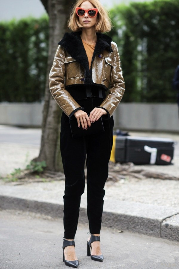 超短的夹克很轻松能打造一种胸下方全是腿的效果,内搭选择同色系最好。