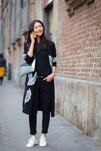 一身黑的造型充满细节,刺绣的外套让整个黑色look不显单调,用一双运动鞋结尾充满了运动混搭风。