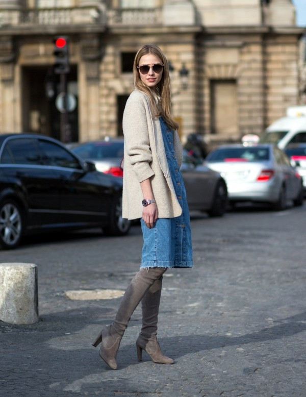 米色和蔼可亲的属性即使搭配了复古的牛仔裙和麂皮的长靴也非常优雅具有亲和力。