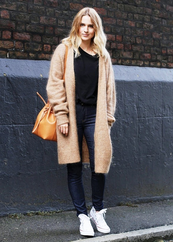 驼色是最适合亚洲人肌肤的颜色之一了,搭配驼色的开衫毛衣千万不要选择饱和度过高的颜色,尽量选择黑色,因为这样最凸显驼色质感,自带的女人为你属性在开衫上当然也不会丢失。