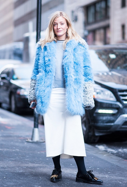 蓝色皮草搭配一条白色直筒裙,从颜色上就为沉闷冬季带来新鲜的视角。