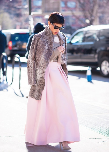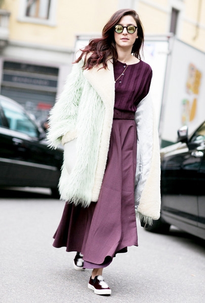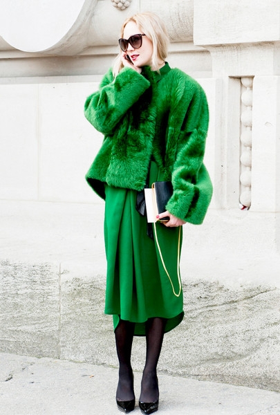作为时装高手来说,买一件抢眼色系的皮草也不失为一种风格,当然,在搭配上就需要别出心裁的选择同色系长裙来展现独特的品味。