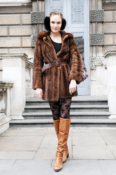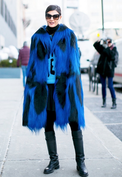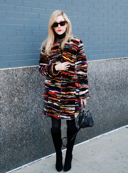 拼色皮草大衣只需一双黑色高跟长靴的点缀就能增添时髦度。