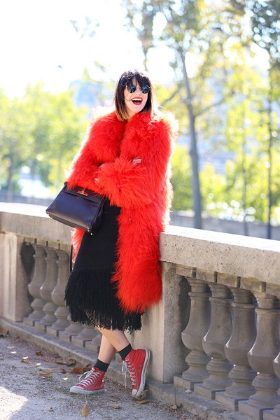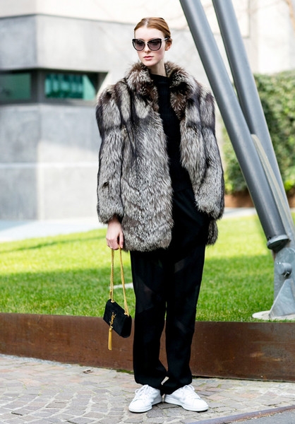 搭配功力有自信的女人可以选择这种皮草与匡威鞋的搭配,让皮草的厚重感在一双球鞋的衬托下轻盈起来。